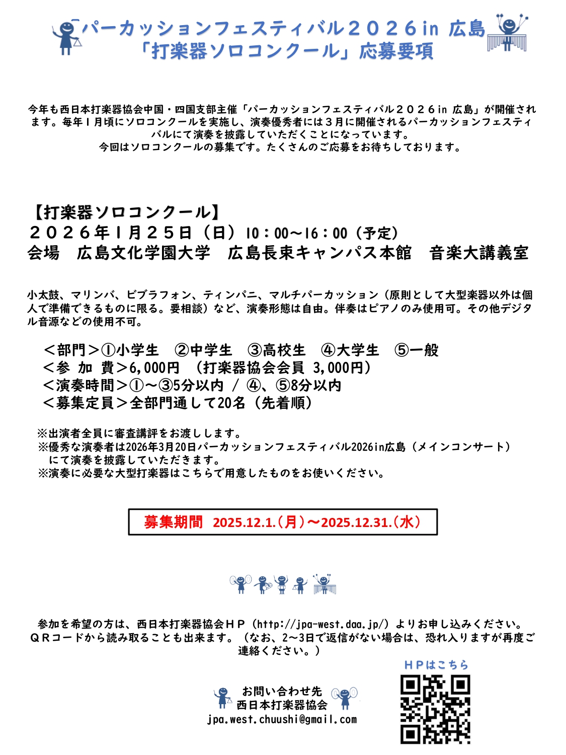 ※優秀な演奏者は2026年3月20日開催のパーカッションフェスティバル2026 in 広島(メインコンサート)にて演奏を披露していただきます。